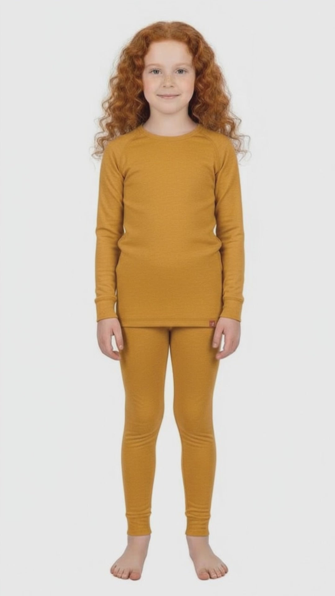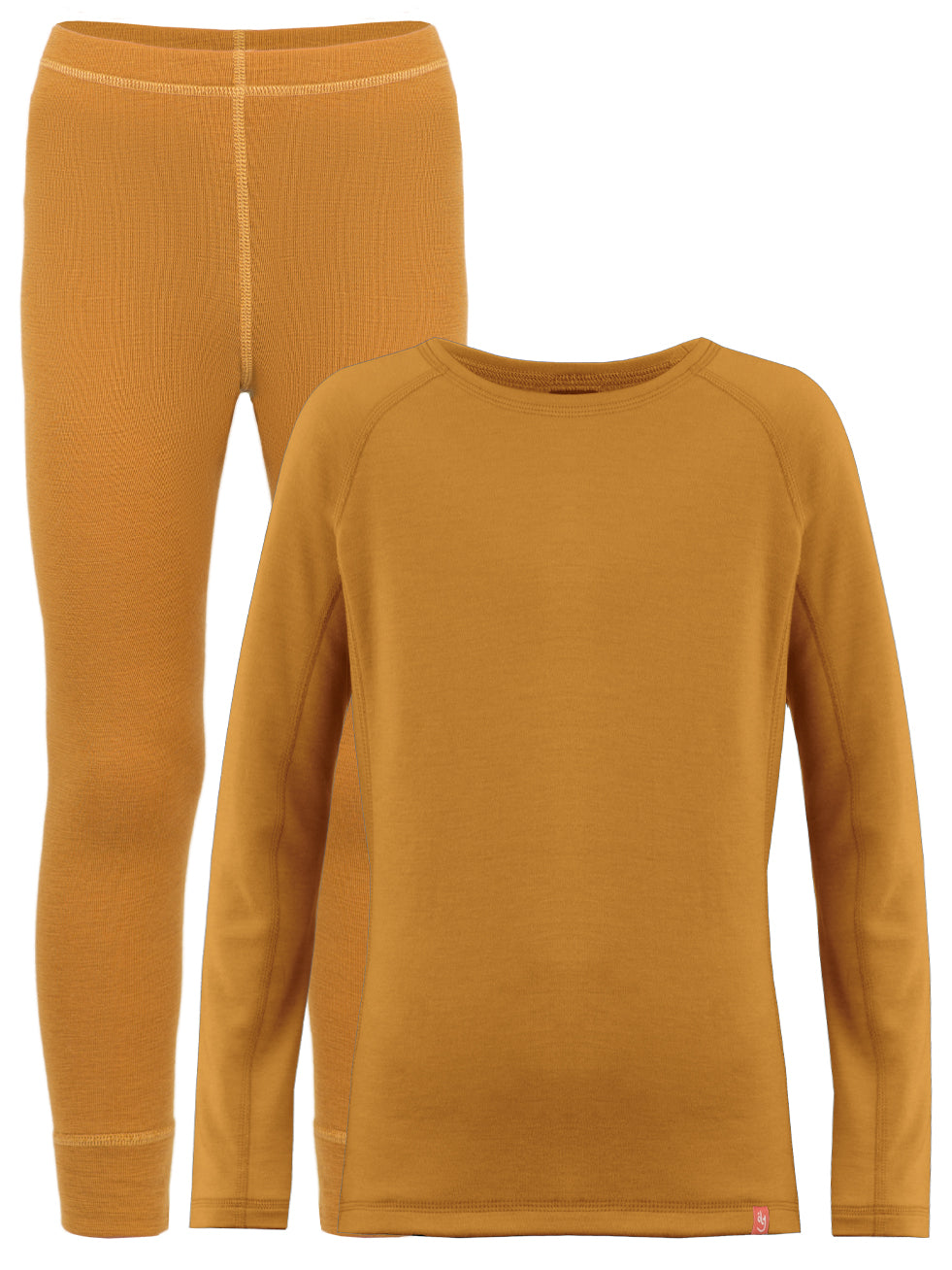 Conjunto de ropa interior térmica para niños Wooly de lana merino suave en color mostaza, de 2 a 10 años